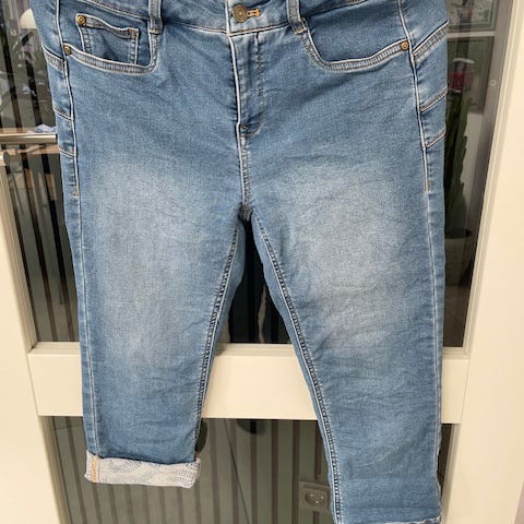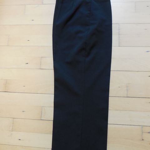Elastik i taljen samt bindebånd, sidelommer. Lille elastikdetalje i bukseben både udvendig og indvendig. Længde fra talje til nederste kant 111 cm, indvendig benlængde 80 cm.