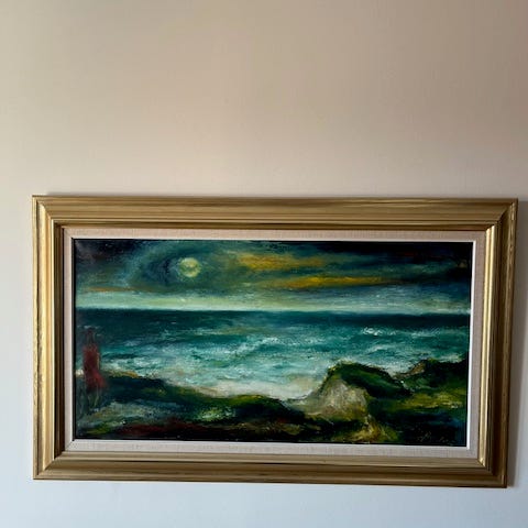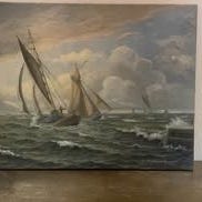 Maleri af A. Romby med grønlandsk motiv. Måler 55 x 58 cm. Maleri der viser en mand i en båd omgivet af isbjerge og vand. Billedet har en ramme i træ. Motivet er naturinspireret med fokus på arktiske elementer.