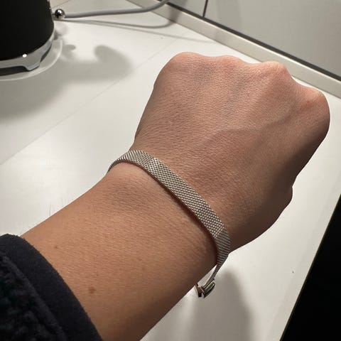 The clip attaches to the single station at the center of the bracelet, which anchors six delicate sterling silver chains. Available in four sizes.