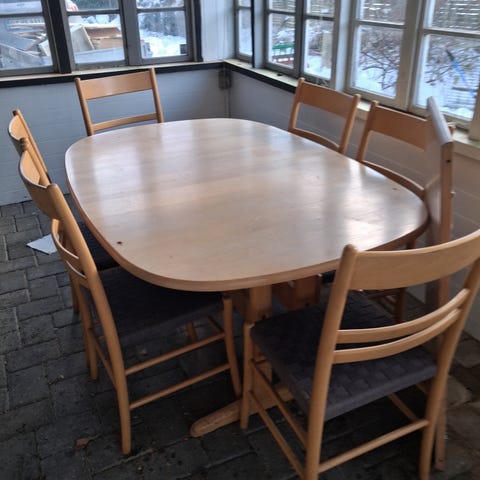 Gangsø spisebord sæbebehandlet bøgetræ med tillægsplader samt 6 stole. Bordet har en rundet firkantet form og er velegnet til spisestue. Materialet er træ, og sættet inkluderer både bord og stole i samme stil.