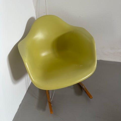 Eames Plastic Armchair gyngestol i cremefarvet plast med metalstel og træskinner. Stolen trænger til en omlakering - stolen har armlæn og er designet til at give komfort og støtte. Velegnet til brug som en loungestol eller dekorativ stol i hjemmet.