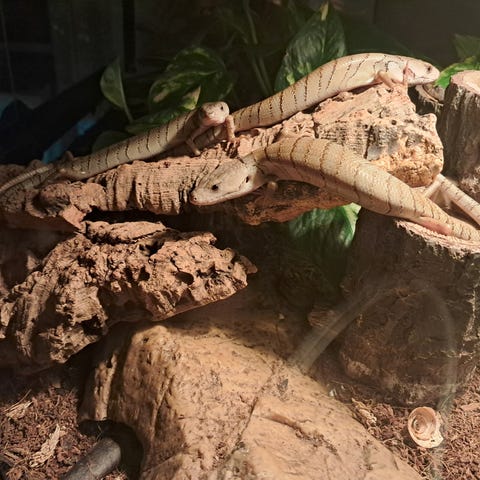 Den største er meget rolig, nysgerrig og elsker mad — især snegle (levende eller frosne), voksmøl-larver, små stykker grisehjerte, hundefoder og museunger.