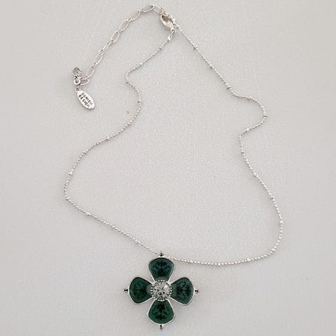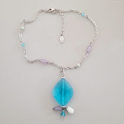 Sød og farverig halskæde fra Pilgrim med facetslebne sten i blå farver og en emalje-blomst. Længden kan justeres.