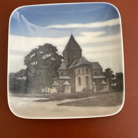 Askebæger fra Bing og Grøndahl. Størrelse 12 x 12 cm. Motiv: Vor Frue kirke, Skive. Også kaldet den gamle kirke.
