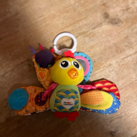 Fisher-Price børnelegetøj med farverige elementer og interaktive funktioner. Legetøjet har forskellige teksturer og former, designet til at stimulere børns sanser og motoriske færdigheder.