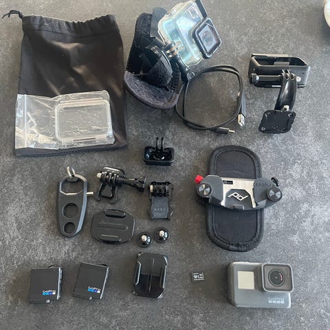 GoPro actionkamera med tilbehør, herunder bæresele, opbevaringsetui og håndholdt stang. Kameraet er designet til at optage video og billeder under forskellige forhold og aktiviteter.