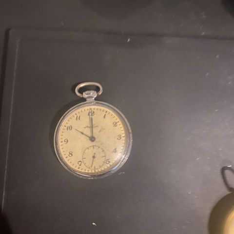 Antique Ancre lommeur med rund urskive og romertal. Uret har en metal urkasse med mønstret bagside og en lille sekundviser ved 6-tiden. Mekanisk optræk med synlige detaljer på indersiden af låget.