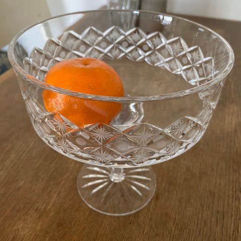 Krystalskål på fod. Ukendt hvorfra. Ca 14,5 cm høj.