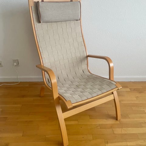 Højrygget lænestol i egetræ,med ryg i fransk flet,løs hynde med stibet betræk.