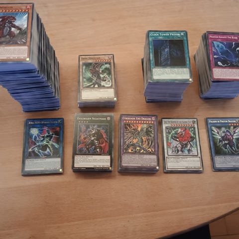 Jeg sælger hele min samling dag jeg ikke føler jeg leger har råd til at spille mere. Samlingen består mest a Structure Decks og decks jeg selv har lavet, kan ikke huske all Structure Decks men de decks jeg selve lavet er "Red eyes", "Red eyes archfiend", "Red eyes Zombie Dragon", "Galaxy eyes", "Elemental hreo" and "Destiny hero". Der i alt 14 Link kort, 13 Synchro kort, 44 Fusion kort, 55 XYZ kort, 431 Effect monsters kort, 67 Normal monster kort, 6 Ritual monster kort, 237 Spell kort, 176 Trap kort
