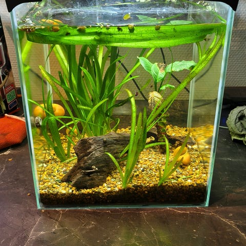 Cirka 10 liter og derfor til rejer, snegle og planter