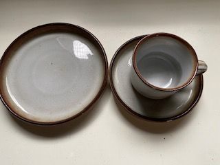 Sonja kaffestel bestående af 8kopper, 8 underkopper, 8 kagetallerkener og fløde/sukkersæt i keramik. Stellet har en neutral farve med brune kanter.