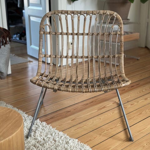 Lænestol i lys grå. Både stol og skammel er i god stand til uden nævneværdige tegn på slid.