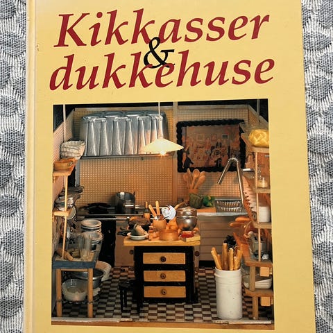 Super sød kikkasse med dukkehusmøbler bestående af seng med rødt og hvidt ternet sengetøj, puslebord med spejl, vugge, garderobeskab, samt diverse tilbehør som tøj og små møbler og legetøj til børnene.