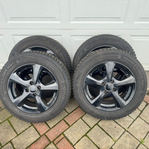 Vinterdæk m. 6-7mm mønster tilbage på stålfælge. Der er dæktrykssensor på dækkene. Mærke Gislaved.