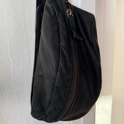 Yvonne Kone læder clutch. Tasken er sort. Den har en lynlås og en foldbar lukning. Inkluderer en stofpose til opbevaring.