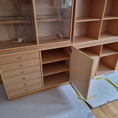 Modulerne er hvide med låger i en flot støvet grøn/blå nuance.