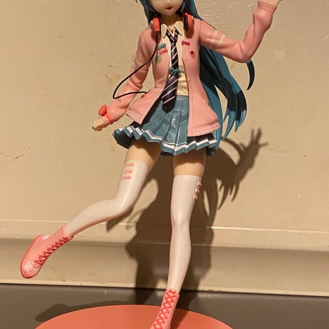 BiCute Bunnies WHITEver figurine med blå hår, hvid kaninkostume, sorte strømpebukser og blå sko. Figuren er detaljeret og står på en rund base.