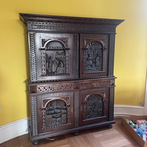 Antik træskab vægskab med klassisk design og naturlig træfinish. Skabet har en enkelt dør med nøglehul og en skuffe under.