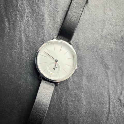 Skagen Denmark armbåndsur med sort læderrem.