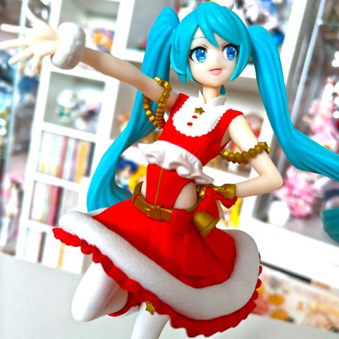 Hatsune Miku Winter Image figurine med detaljeret design og farverig beklædning. Figuren står på en rund base og viser karakteren i vintertema med lang turkis hår, hvid og blå tøj med gule og lyserøde accenter. Velegnet til samling og udstilling.