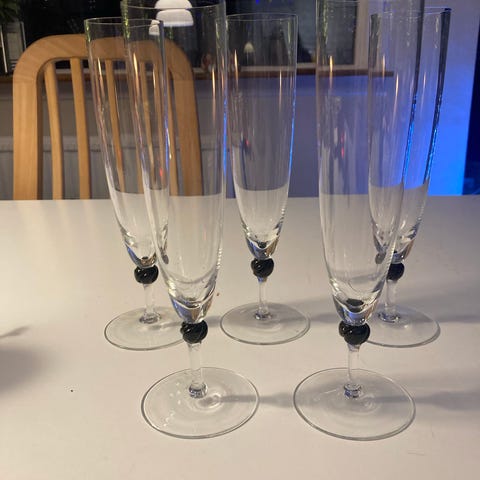 Traditionelle champagneglas med sekskantet stilk, pris er for alle 5. Se også vores andre annoncer. Afhent i Køge eller sendes. Tlf 40500544