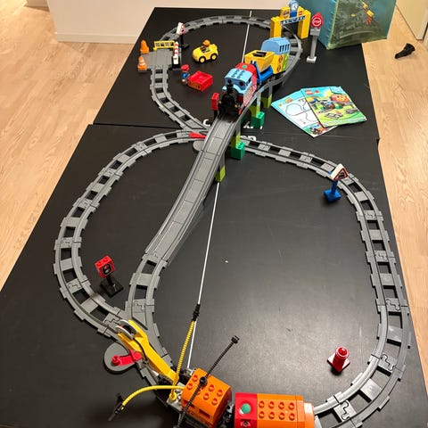LEGO DUPLO City kæmpe togbanesæt med skinner, selvkørende tog og figurer. Sættet indeholder kurvede og lige skinner, signaler, skiftespor, bomme og forskellige byggeklodser i flere farver. Designet til børn, der ønsker at bygge og lege med tog og bymiljø.