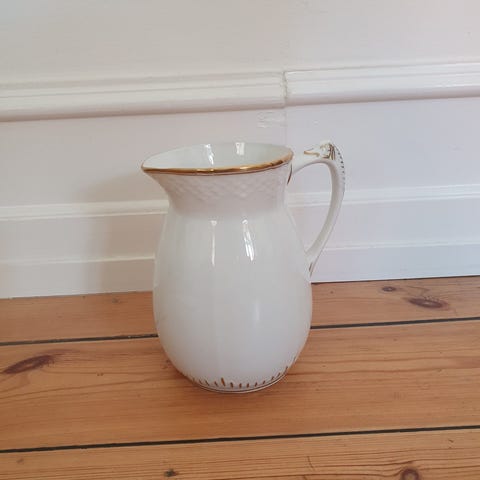 Bing & Grøndahl Hartmann flødekande (modelnummer 189). Kanden har et klassisk hvidt design med gulddetaljer langs kanten og håndtaget.