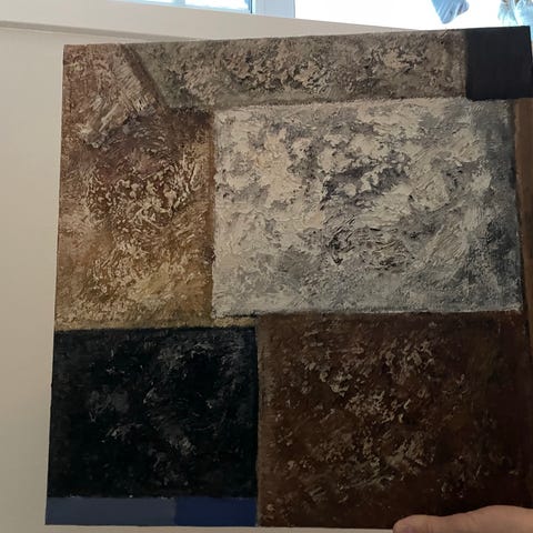 Freddy Eriksen - To malerier med abstrakte motiver, herunder et landskab og en figur. Begge er indrammet i trærammer og har varme farvetoner.