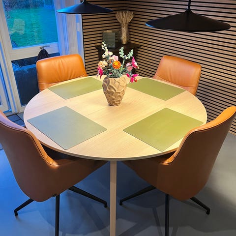 Rundt spisebord med udtræk, måler 190 x 110 når det er slået ud. Egetræ så vidt jeg husker, kan slibes ned og gives olie. Der er ikke større hak eller skader på bordplade eller ben. Købt for 5 år siden til 5000kr.