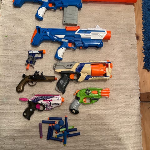 Nerf Guns legetøjsvåben og tilbehør, inklusive flere forskellige modeller og farver.