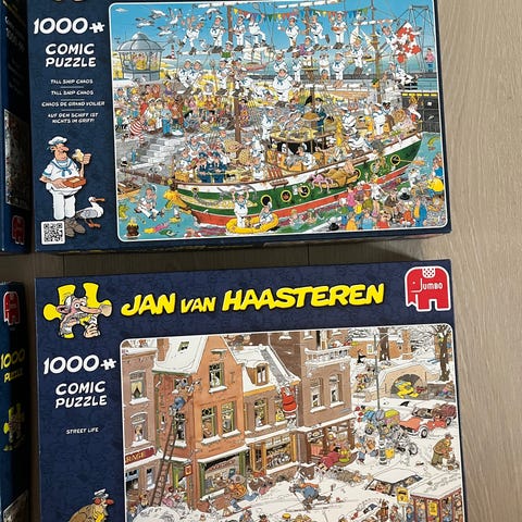 Jan van Haasteren puslespil med 1000 brikker. Indeholder flere motiver med detaljerede illustrationer. Passer til voksne og børn med interesse for puslespil.