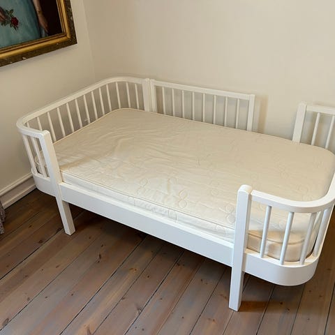 Smuk og tidløs juniorseng fra danske Oliver Furniture sælges inkl. madras. Sengen er i hvid og naturtræ med det karakteristiske nordiske design – minimalistisk, men varm og indbydende. Den har afrundede hjørner og en sikkerhedsbarre, som gør den ideel til børn, der er ved at skifte fra tremmeseng til almindelig seng.