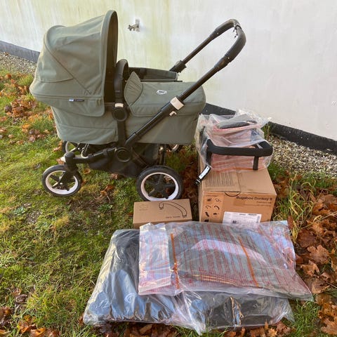 Bugaboo donkey forest green. Næsten alle dele er nye. Stellet er sort, model 3. Med kurv og punkterfri hjul. 1 brugt men pæn ramme. 1 ny ramme. 1 grøn liftdel brugt 3 mdr, som ny. 1 grøn side kurv, brugt 3 mdr. 2 nye grønne kalescher. 2 sorte nye sæder. Nye stænger og beslag til 1 kalesche. 2 nye regnslag. 2 nye læderfrontbøjler. Alle de nye dele er fra donkey 5. Jeg har ikke samlet den som dobbeltvogn, så man kan se at alle delene er nye og i original indpakning. Rigtig flot og smart Vogn. Incl babynest som kan bruges i liften, så baby holder sig varm og kopholder. Alle dele så den kan bruges til 1 barn. Og kan bruges til 2 børn på samme tid.