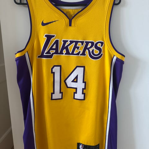 NBA Nike Los Angeles Lakers basketballsæt i størrelse S til herre. Sættet består af jakke og bukser i holdets farver lilla og gul. Materialet er egnet til sportsbrug, især basketball.