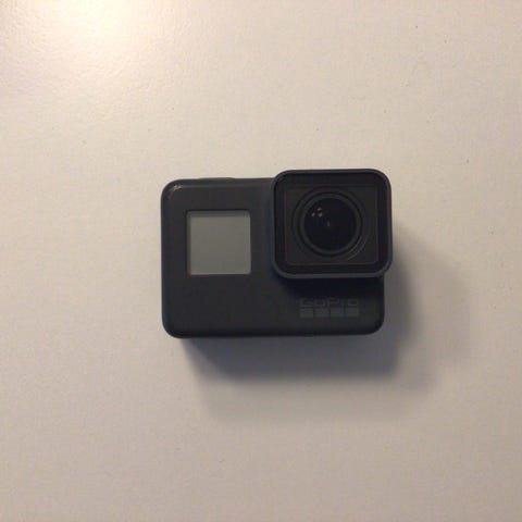 GoPro actionkamera med tilbehør inklusive monteringsudstyr, rem og beskyttelsesetui. Kameraet er designet til at optage video og billeder under forskellige aktiviteter og forhold.