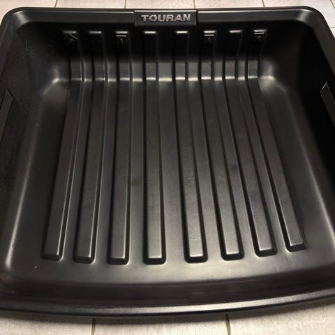 Volkswagen VW Touran bagagerumsbakke / bagagerumsboks i sort materiale designet til at beskytte bagagerummet mod snavs og væsker. Måtten har ribbet overflade for at forhindre genstande i at glide under transport.