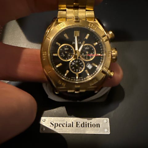 Oliver Coen herre ur. Uret har en guldbelagt urkasse rund hvid urskive og brunt læderrem. Indeholder funktioner til tidsvisning med flere visere.