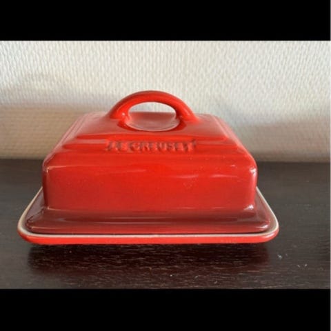 Le Creuset stentøjsmarmeladekrukke m/ spatel i træ og silicone. Fuldstændig som ny. Nypris 349kr.