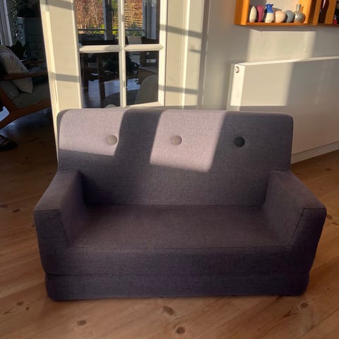 Grå KK Kids Sofa. Det udfoldelige sæde gør sofaen egnet til selv de mindste børn. Sofaen passer nemt ind i de fleste børneværelse. nypris 4000