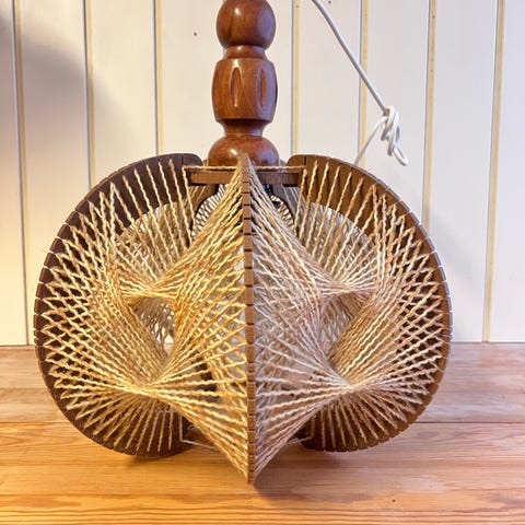 Gammel loftslampe i stof med frynser.