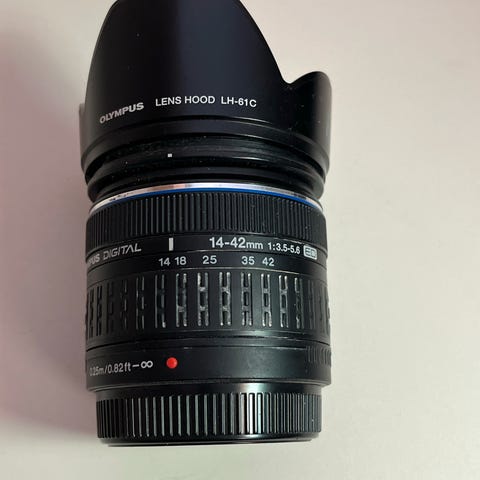 Defekt Olympus M.Zuiko Digital 14-42mm f/3.5-5.6 kameraobjektiv med zoomfunktion.