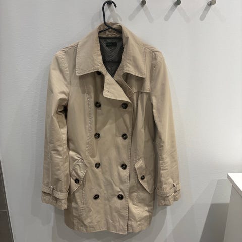 Benetton Frakke i sort farve, ca. EU størrelse 38, lavet af polyester. Jakken er designet til kvinder og har en klassisk frakkestil med knapper foran og lommer. Materialet er polyester, hvilket giver en let og holdbar beklædning. Køber betaler fragt