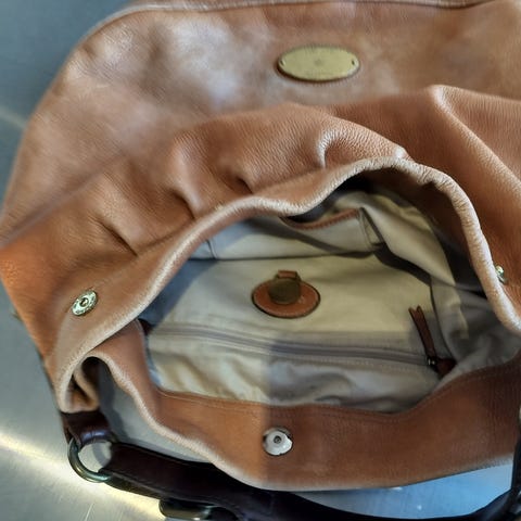Mulberry læder taske i rød farve til kvinder. Tasken har en quiltet overflade og en kæde- og læderrem. Den har et enkelt rum med lukning og et mindre inderrum. Inc kvittering og æske