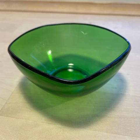 Fransk skål i glas, Vereco. Ca 11 cm bred og 5,5 cm høj. Blå. Ingen skår