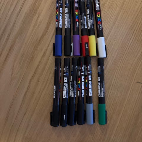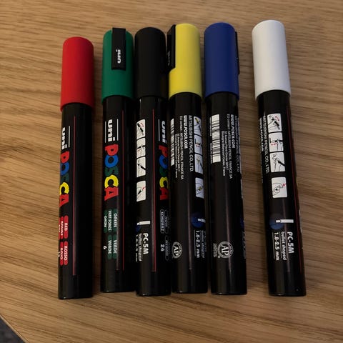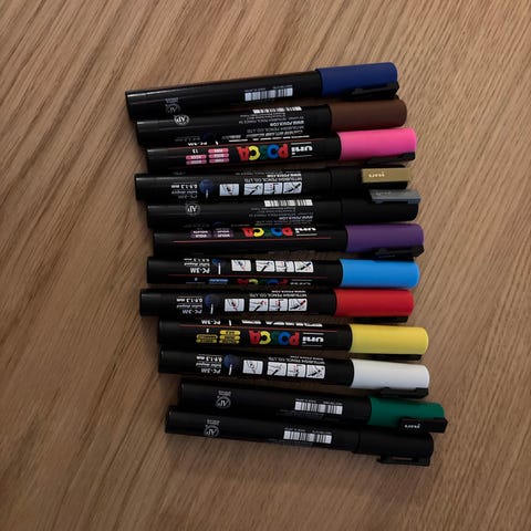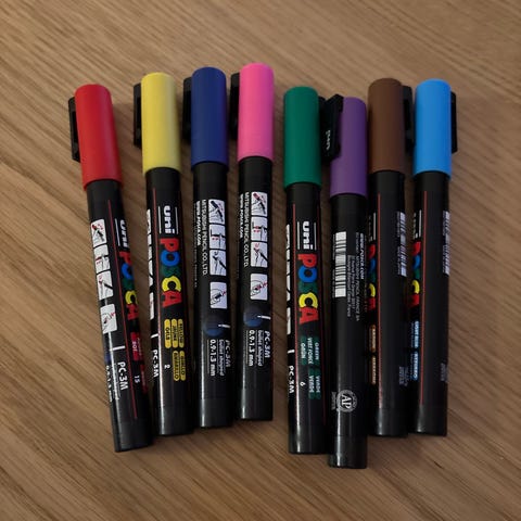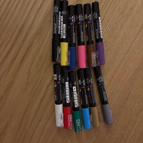 Posca tuscher sæt bestående af 4 farver: blå, lilla, pink og grøn. Tuscherne har sort krop med farvet hætte og clips. Velegnet til tegning og skrivning på forskellige overflader.