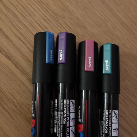 Posca tuscher sæt med 8 forskellige farver: rød, gul, lyserød, grøn, brun, lilla, blå og sort. Velegnet til forskellige kreative projekter og overflader.