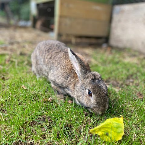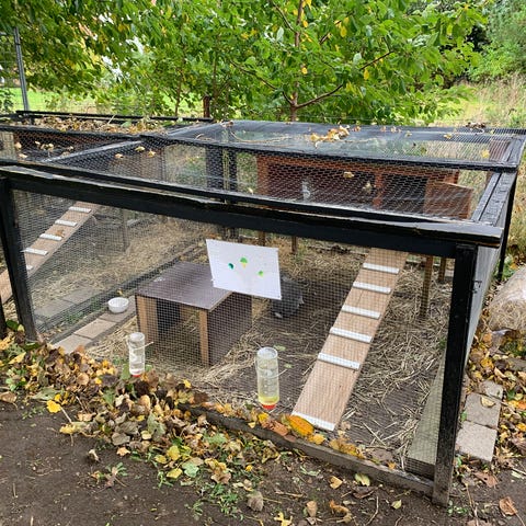 De har et stort udebur, man får med i prisen samt ekstra bur og hø samt legetøj.