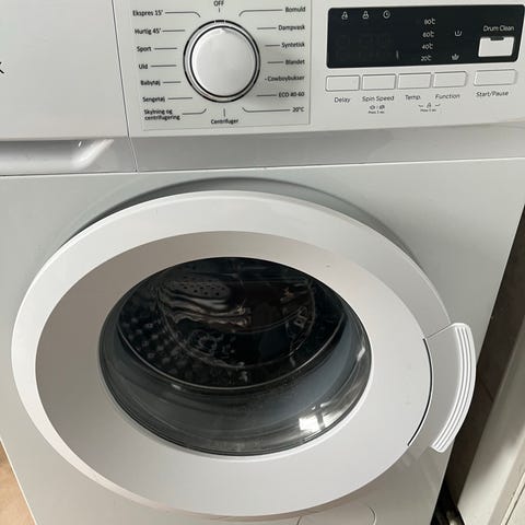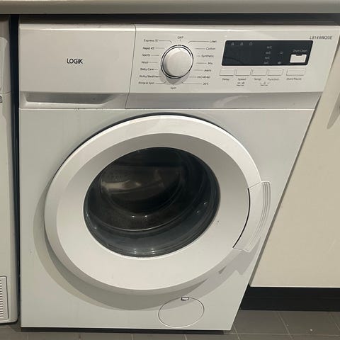 Logik Frontbetjent vaskemaskine med frontbetjent design. Maskinen er hvid og har en brugervenlig betjeningspanel med drejeknap og digitalt display. Velegnet til almindelig tøjvask i hjemmet.