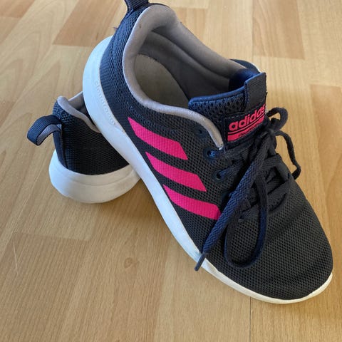 Adidas børnesko til pige i størrelse 23. Skoene er primært pink med hvide detaljer og har en lukning med velcro og snørebånd. Designet til børn med fokus på komfort og funktionalitet.